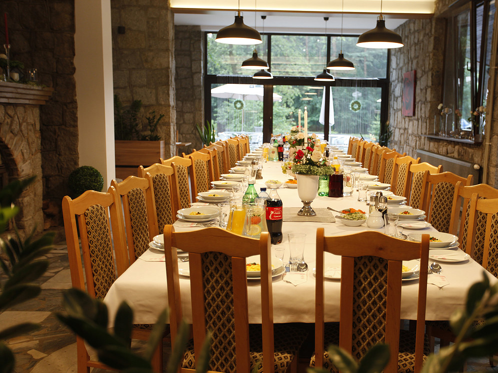 Wyjątkowy nastrój podkreśla kominek. Sala doskonała jest do zorganizowania mniejszych imprez rodzinnych i kameralnych spotkań firmowych. To również wspaniałe miejsce do spotkań przy smacznej kolacji i zabawy w gronie przyjaciół.